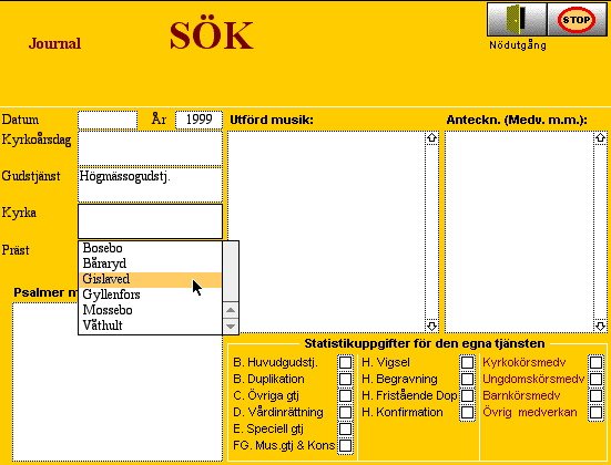 Layouterna i Pro Cantoribus är färgkodade: grönt för Menyer, grått för Inmatningslayouter, gult för Söklayouter, rött för Utskriftslayouter o. s. v.