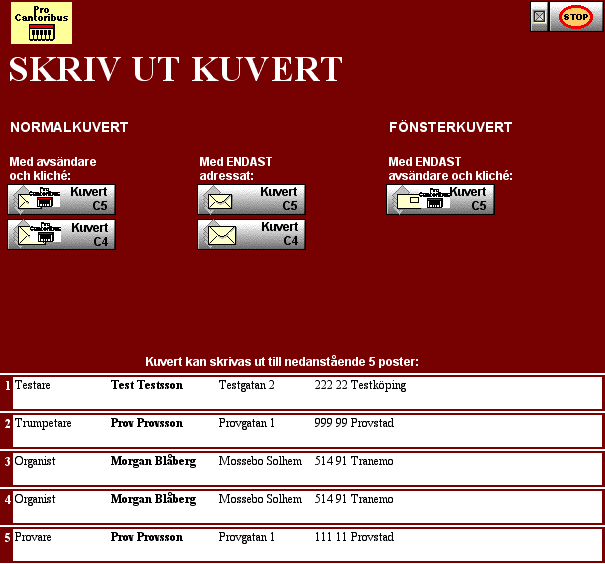 Rutinen för kuvertutskrifter är gemensam för hela Pro Cantoribus:
