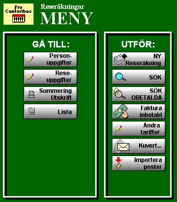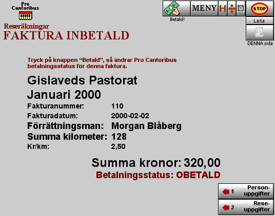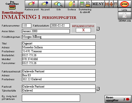 PRO CANTORIBUS RESERÄKNINGAR Fakturerar och håller reda på resor i tjänsten. När inbetalning skett söker du med ett par enkla knapptryckningar fram obetalda poster och ändrar betalningsstatus för inkomna betalda fakturor.